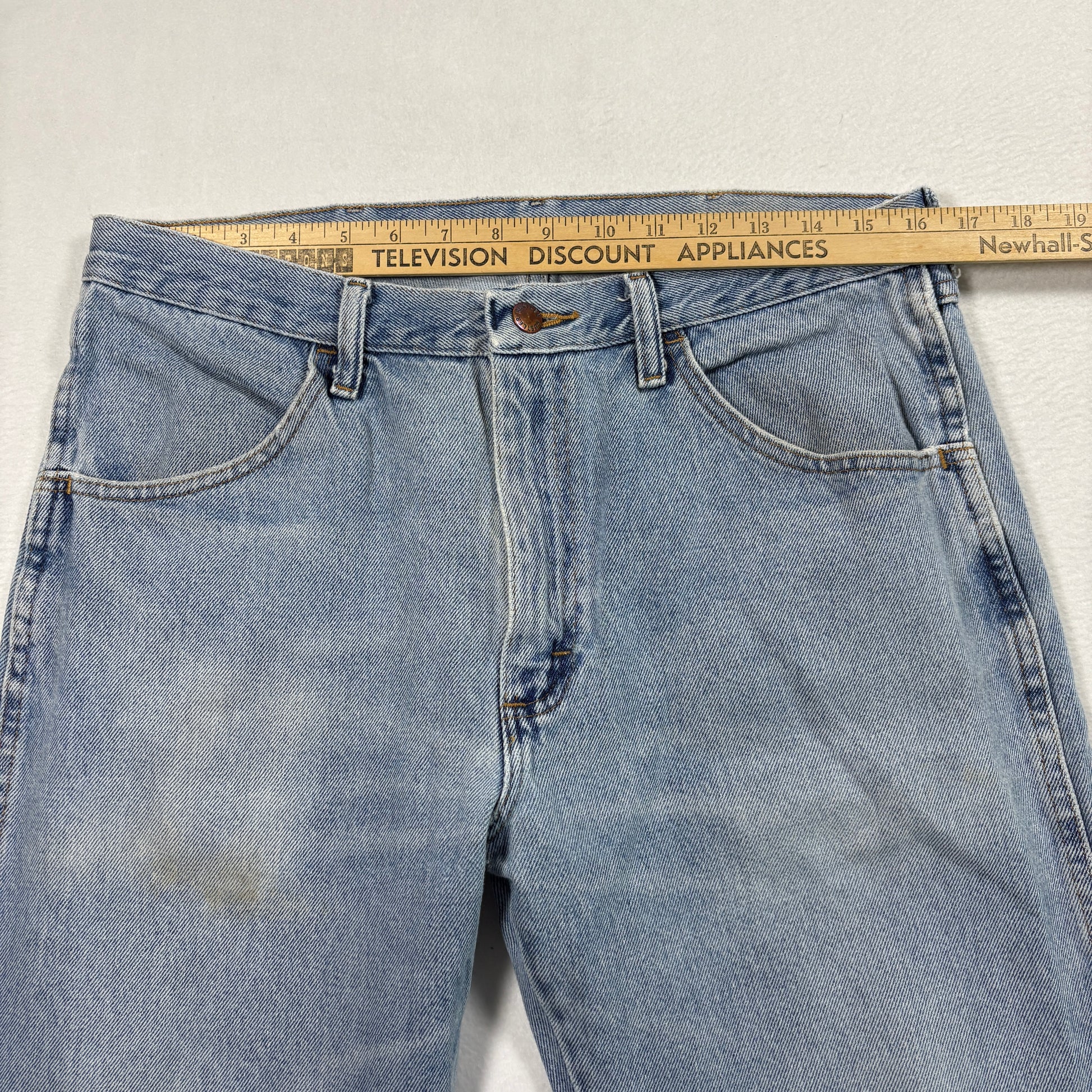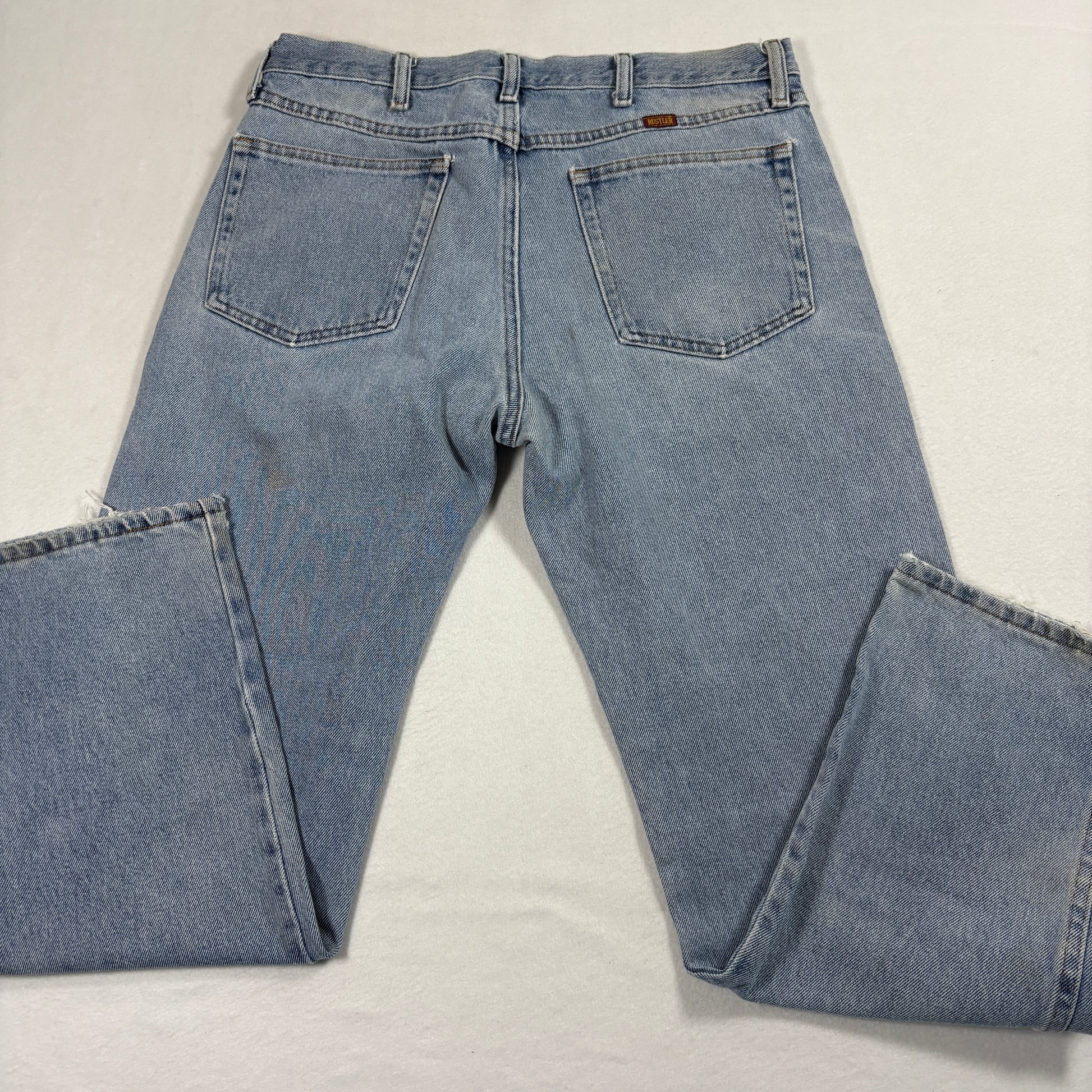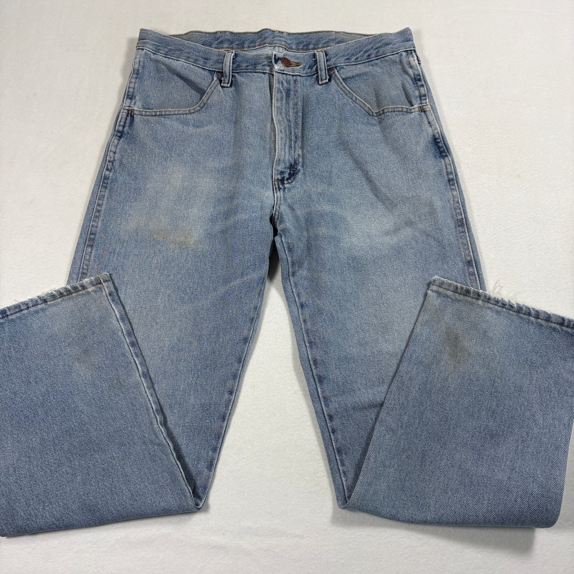Authentic Rustler vintage denim with true Y2K and 90s grunge appeal. Light wash with natural wear makes these jeans perfect for a casual distressed streetwear look. Timeless straight-leg cut and rugged 100% cotton construction.