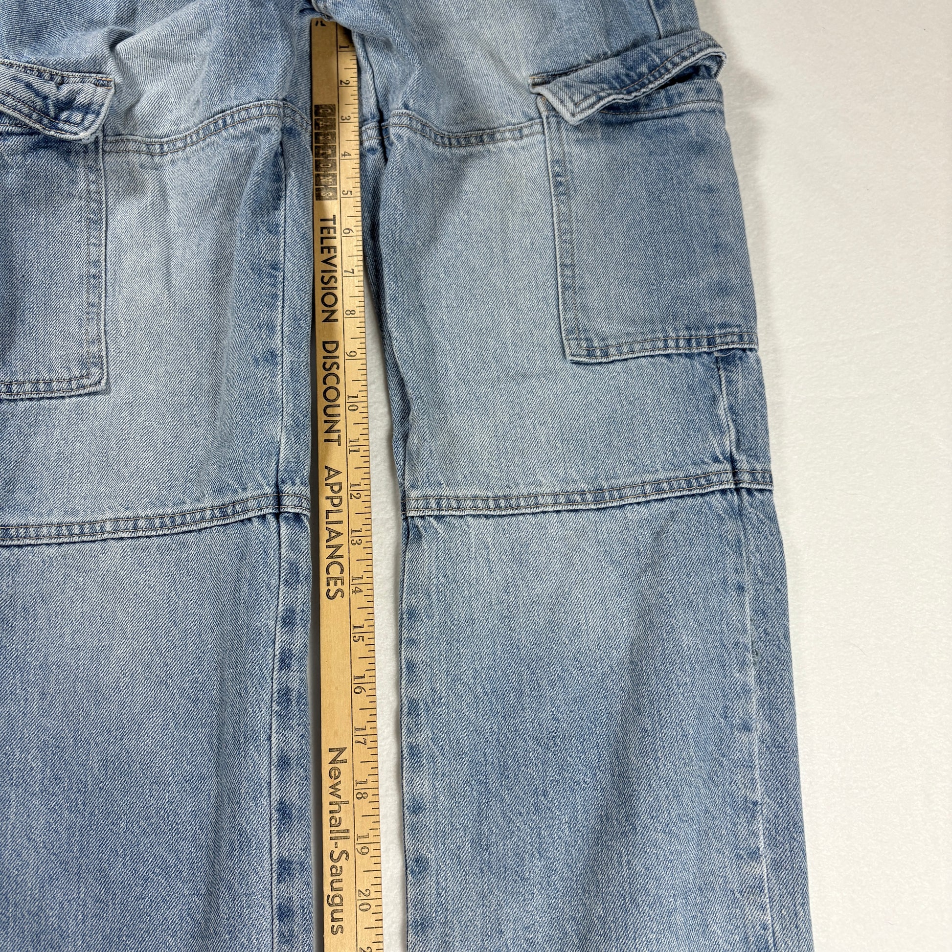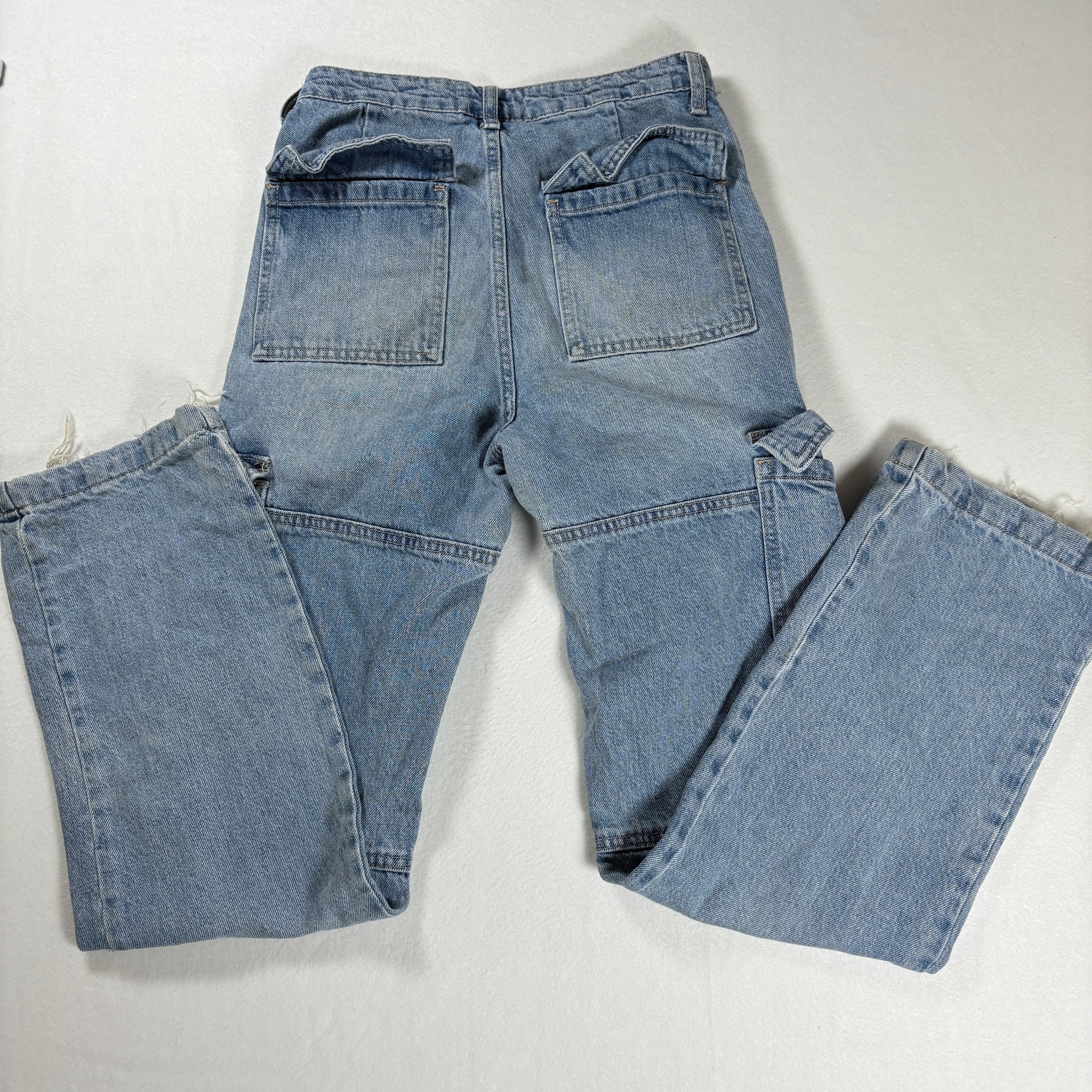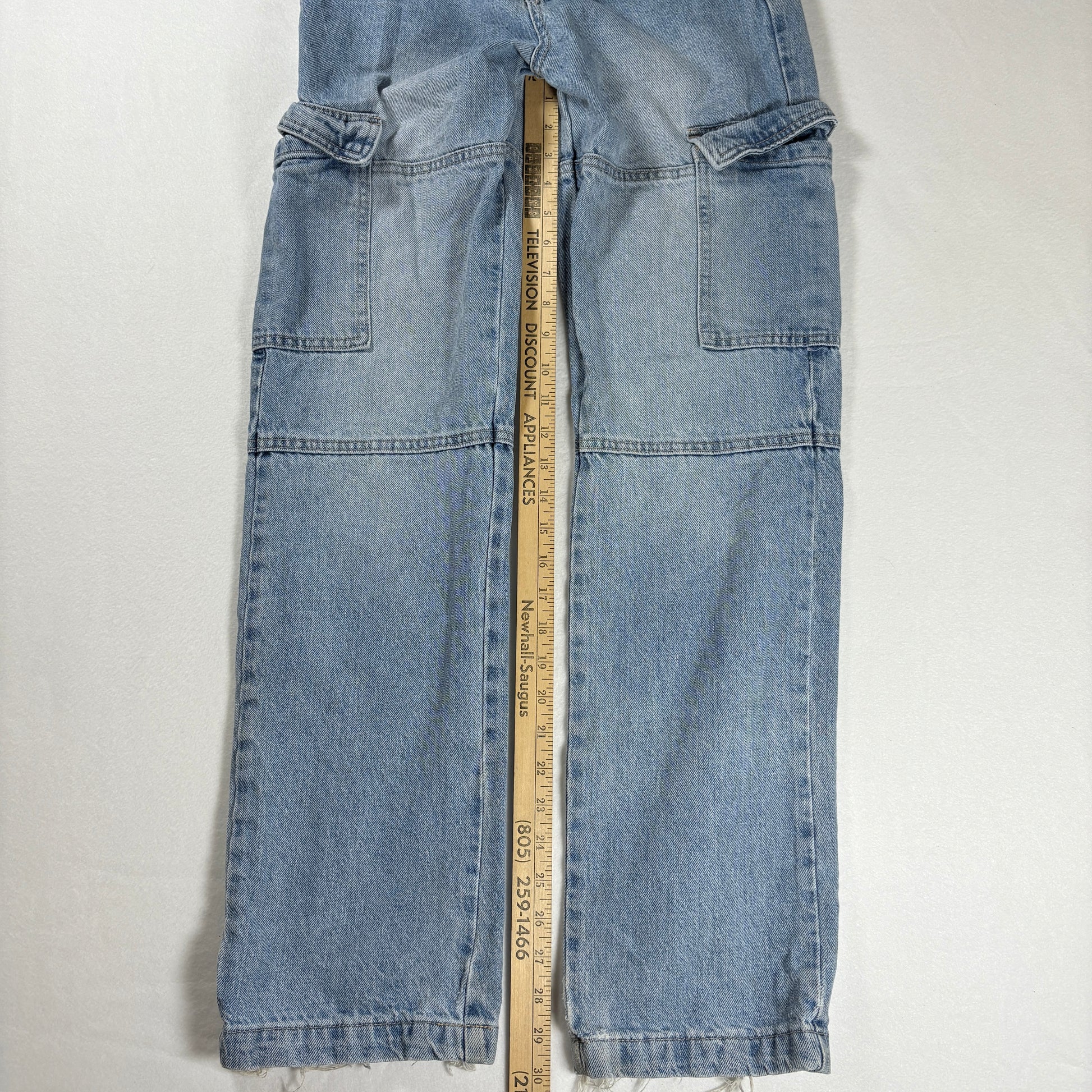 Step into true Y2K vibes with these S.O.N.G. Baggy Cargo Carpenter Jeans in women’s size 3/26. Made from 100% cotton denim, they feature a relaxed, oversized fit with large utility-style cargo pockets and a light wash finish. Raw/frayed hems add to the distressed, lived-in look—perfect for streetwear, skater, or throwback outfits.