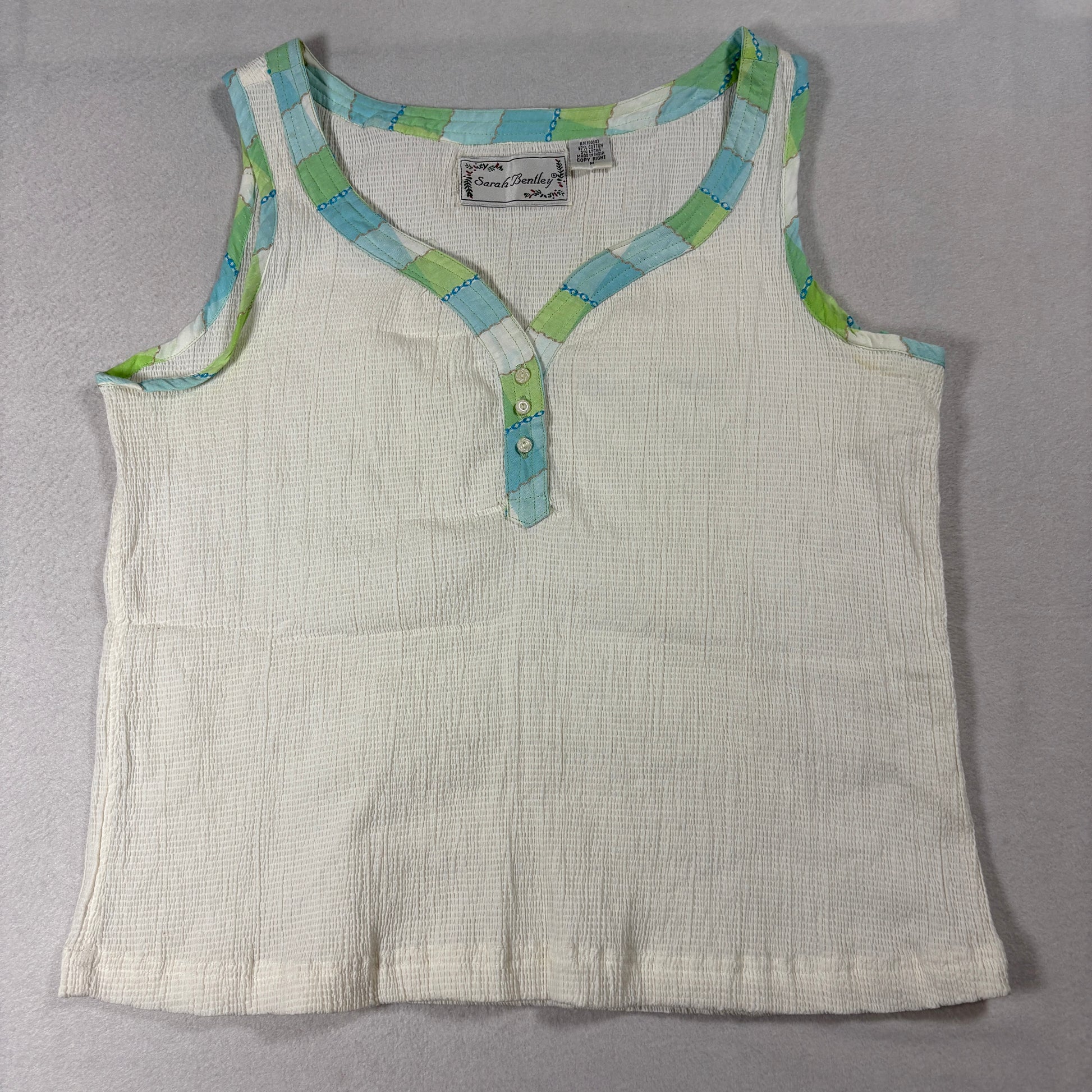 Sarah Bentley White Textured Tank Top Womens M Boho Patch Trim Y2K Summer