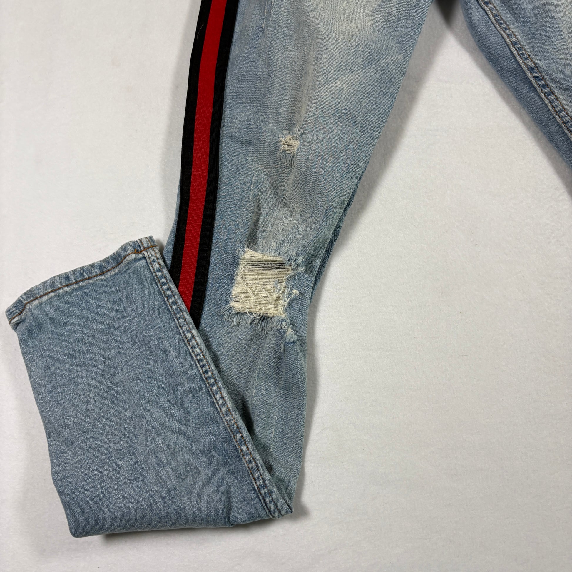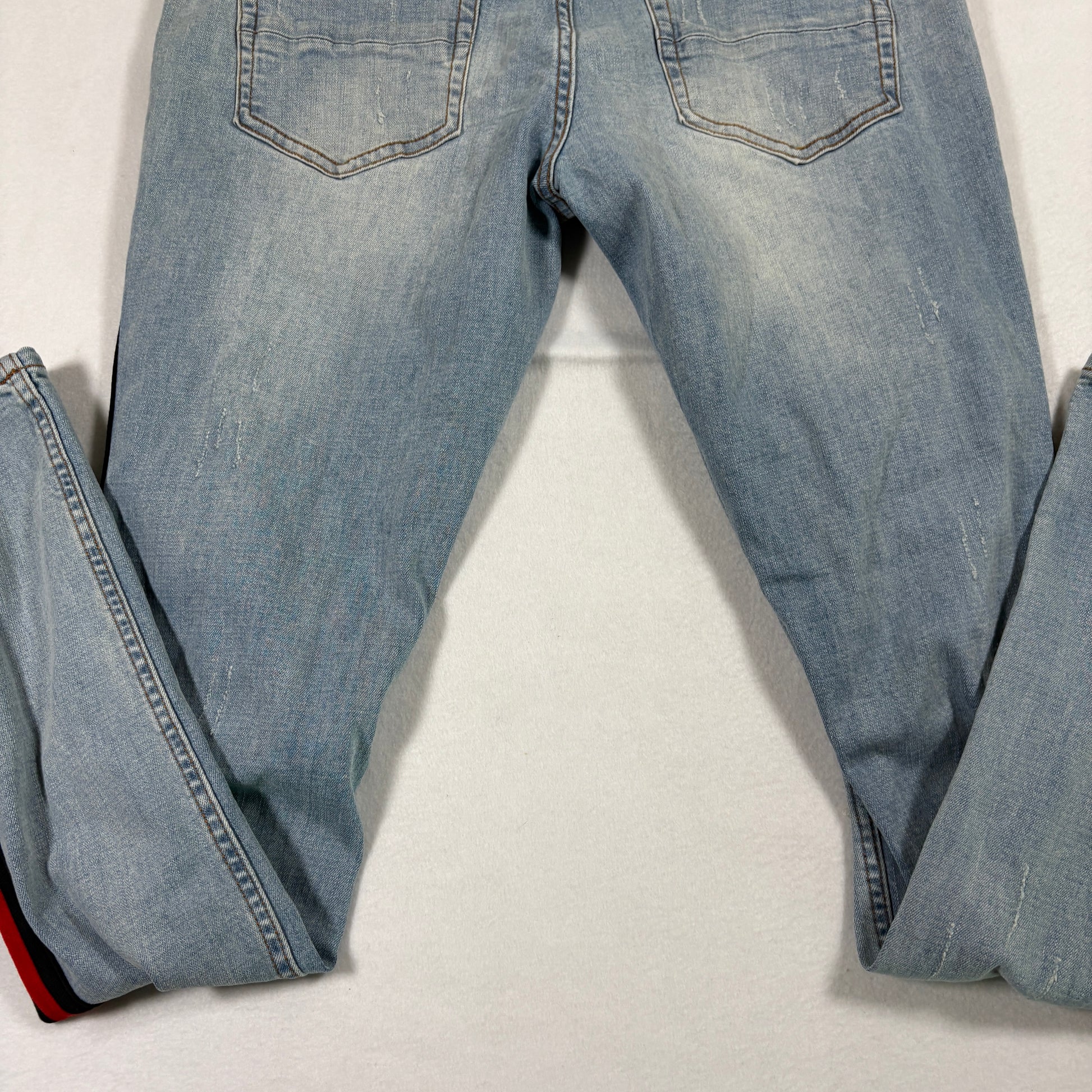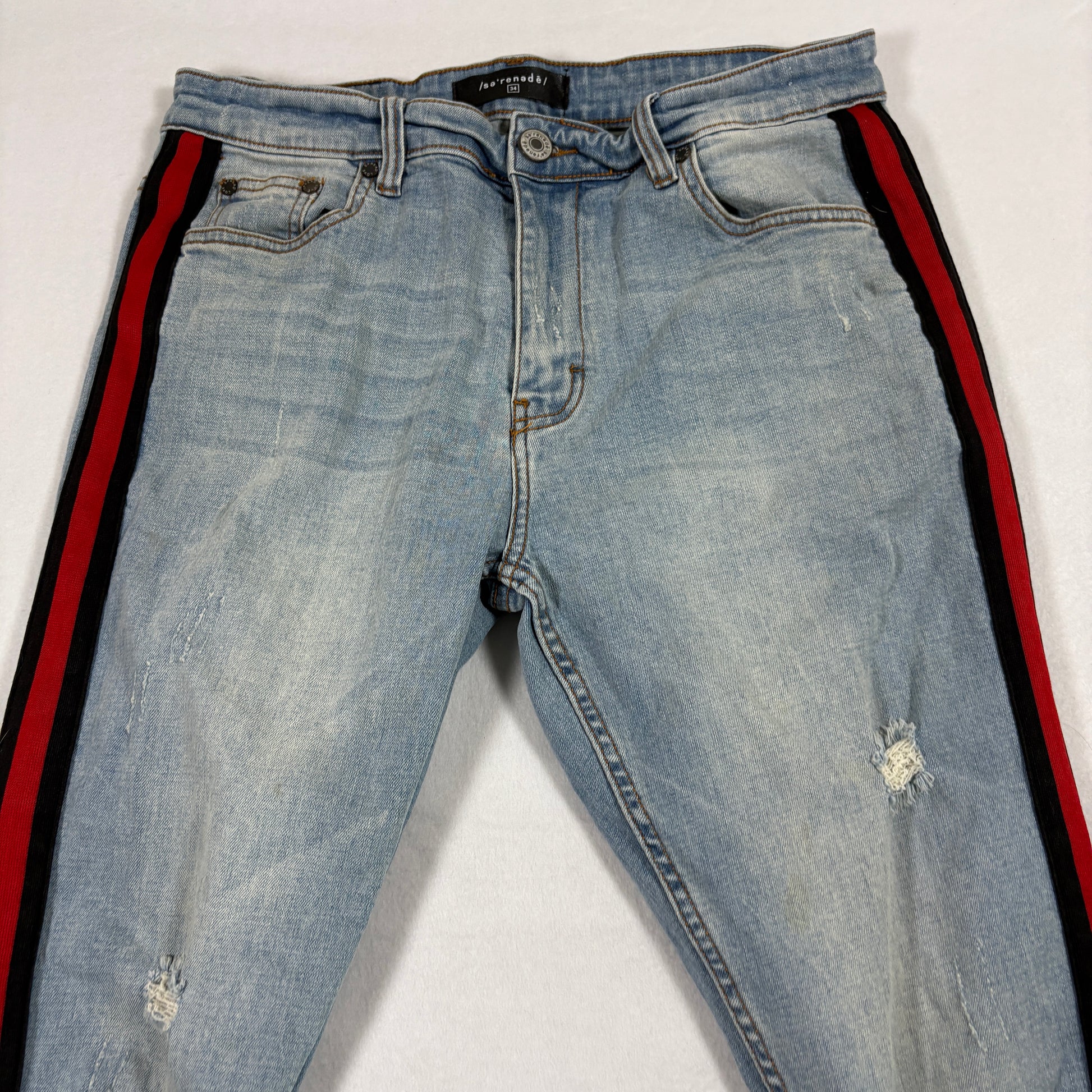 Serenade mens jeans 34 light wash distressed skinny red stripe Y2K grunge denim