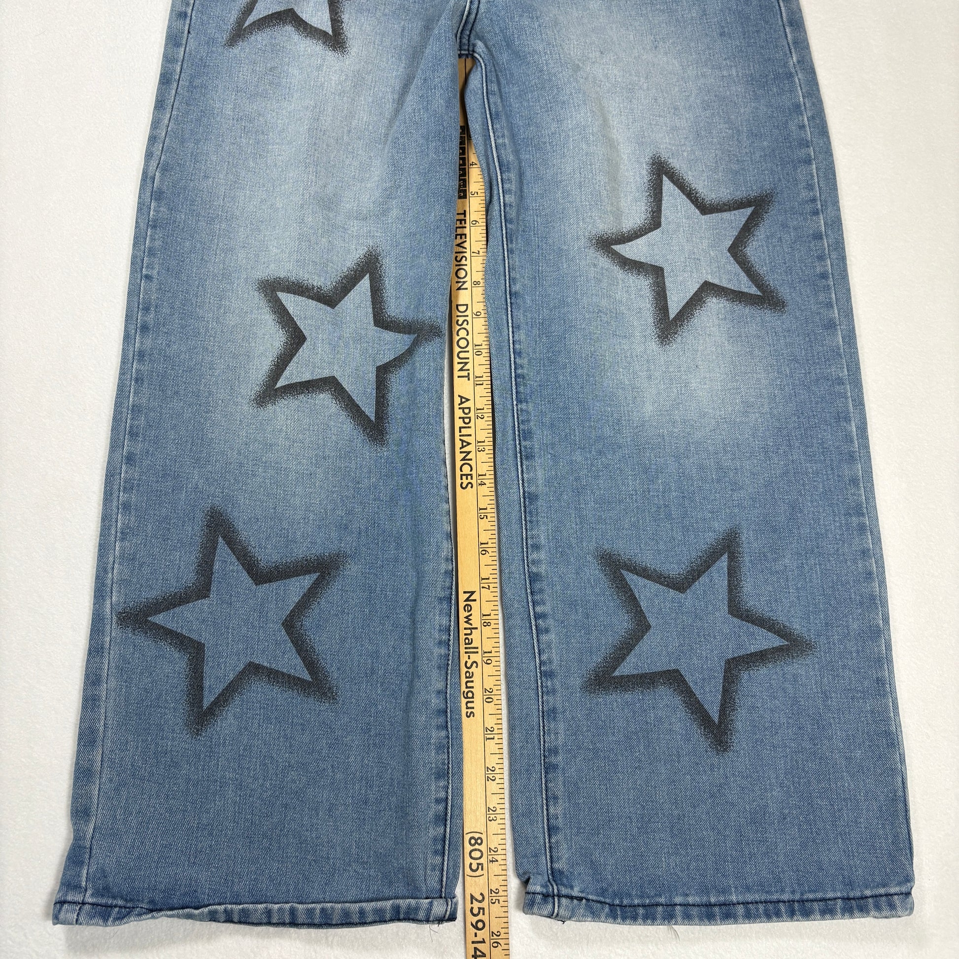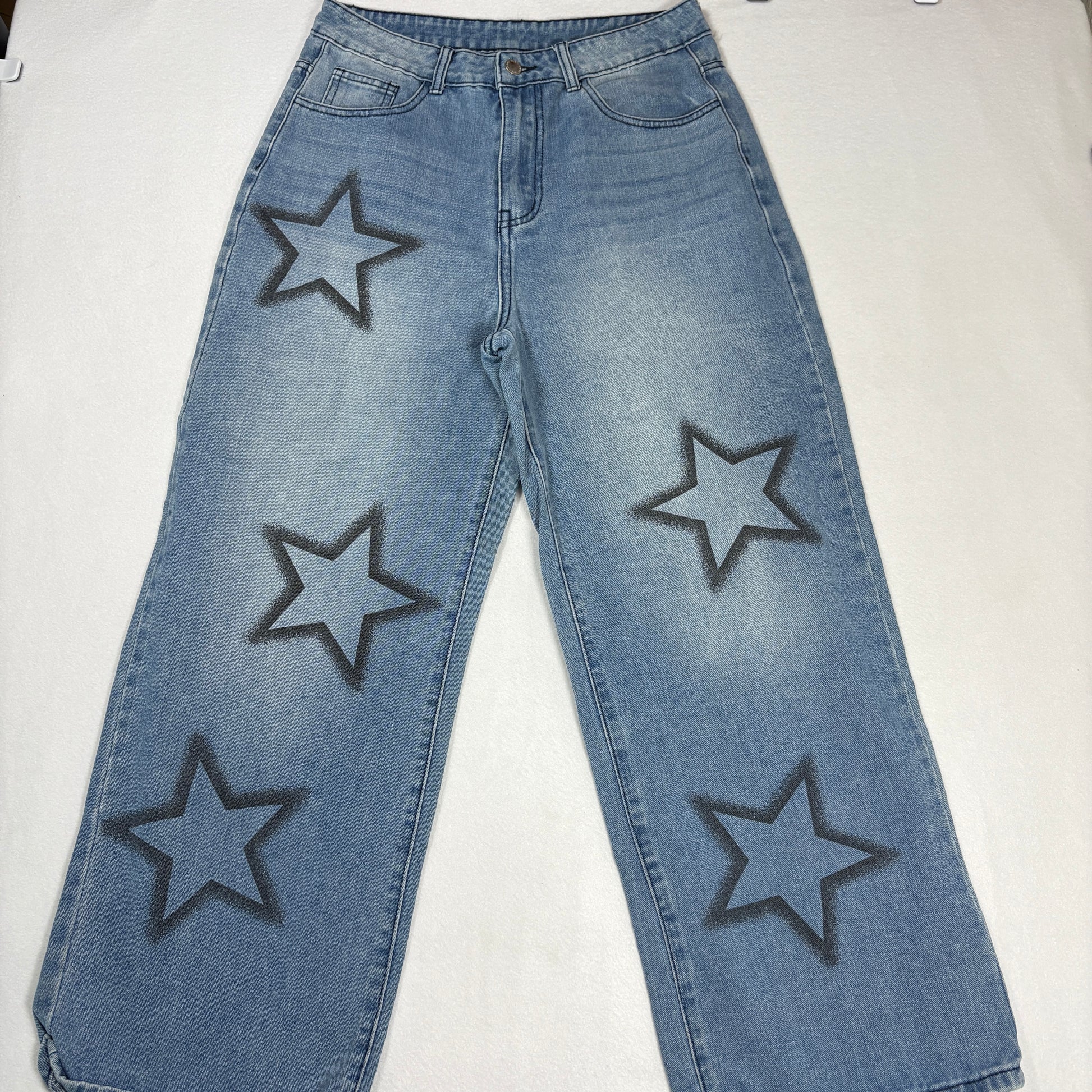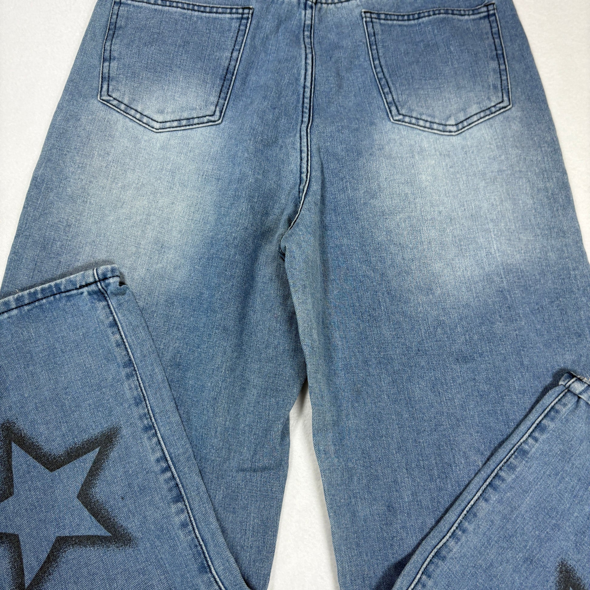 Shein Womens Blue Baggy Jeans Size S Y2K 90s Grunge Star Print Wide Leg Denim