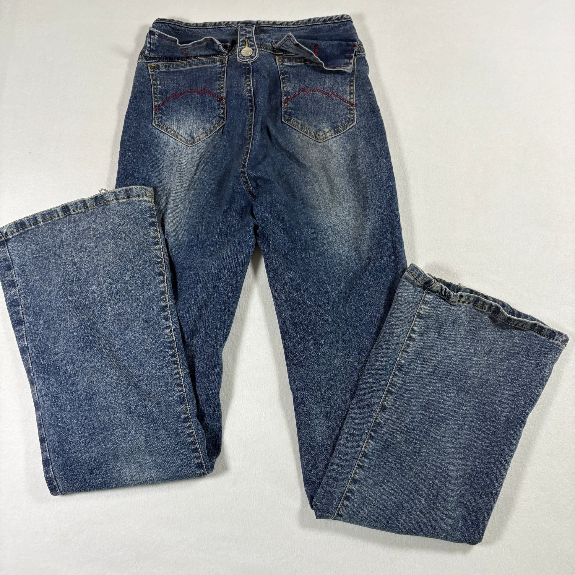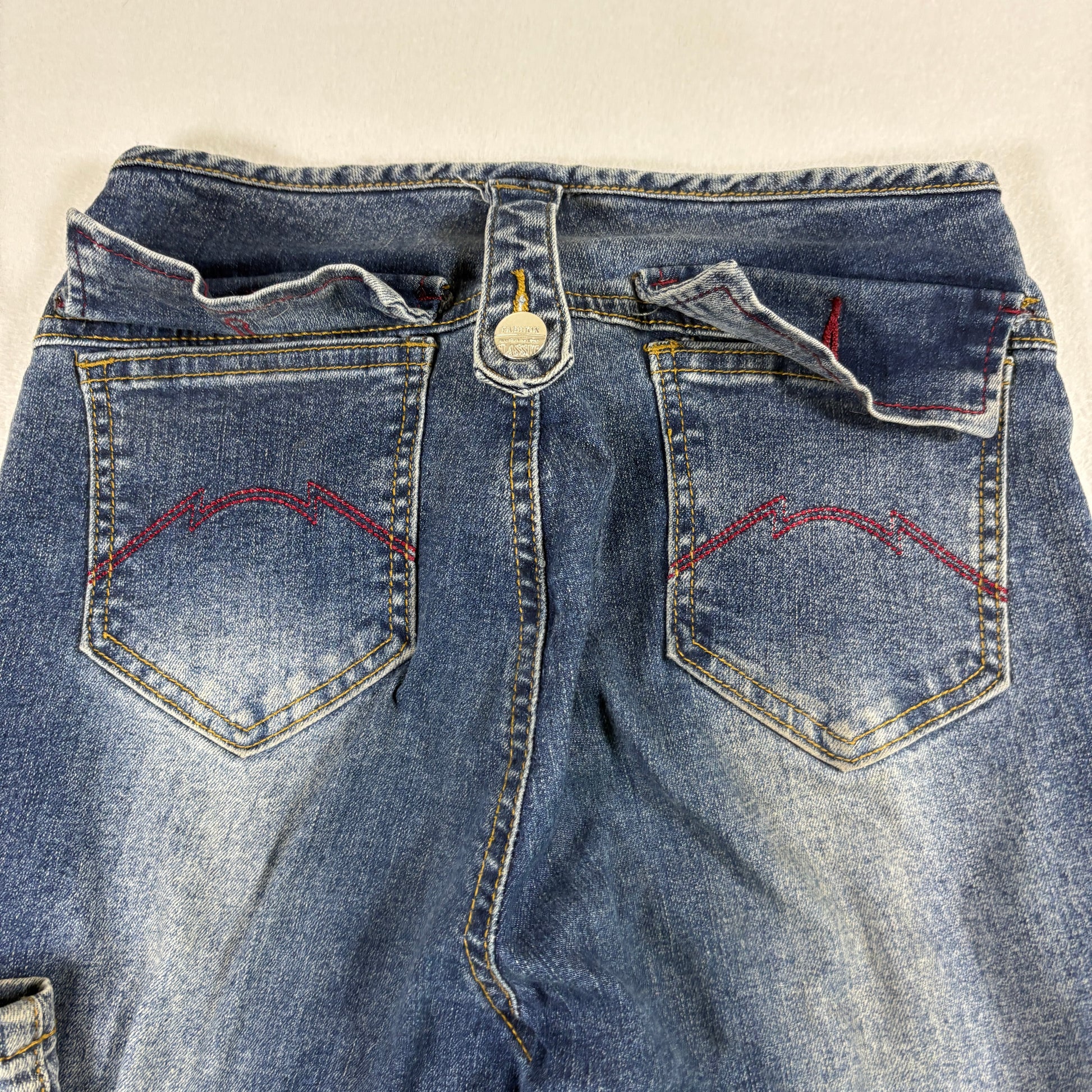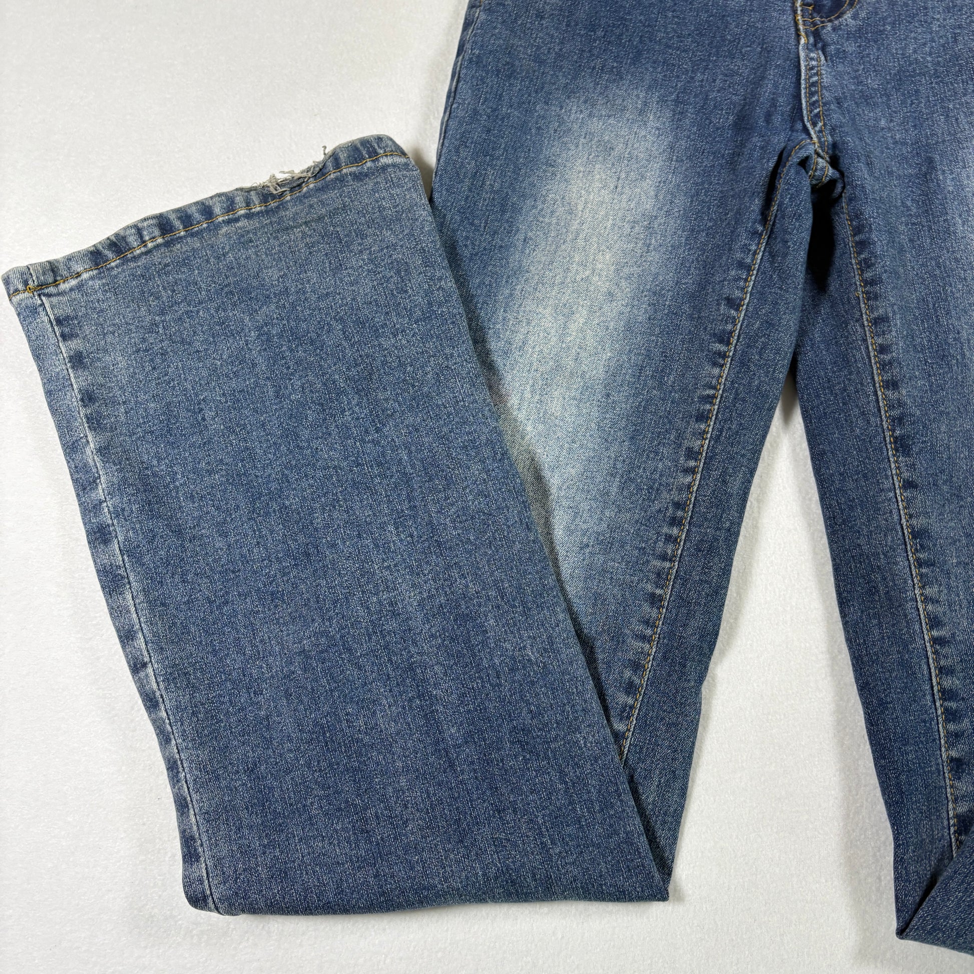 ✓ Flare leg with 4-button fly and wide belt loops, true retro Y2K style