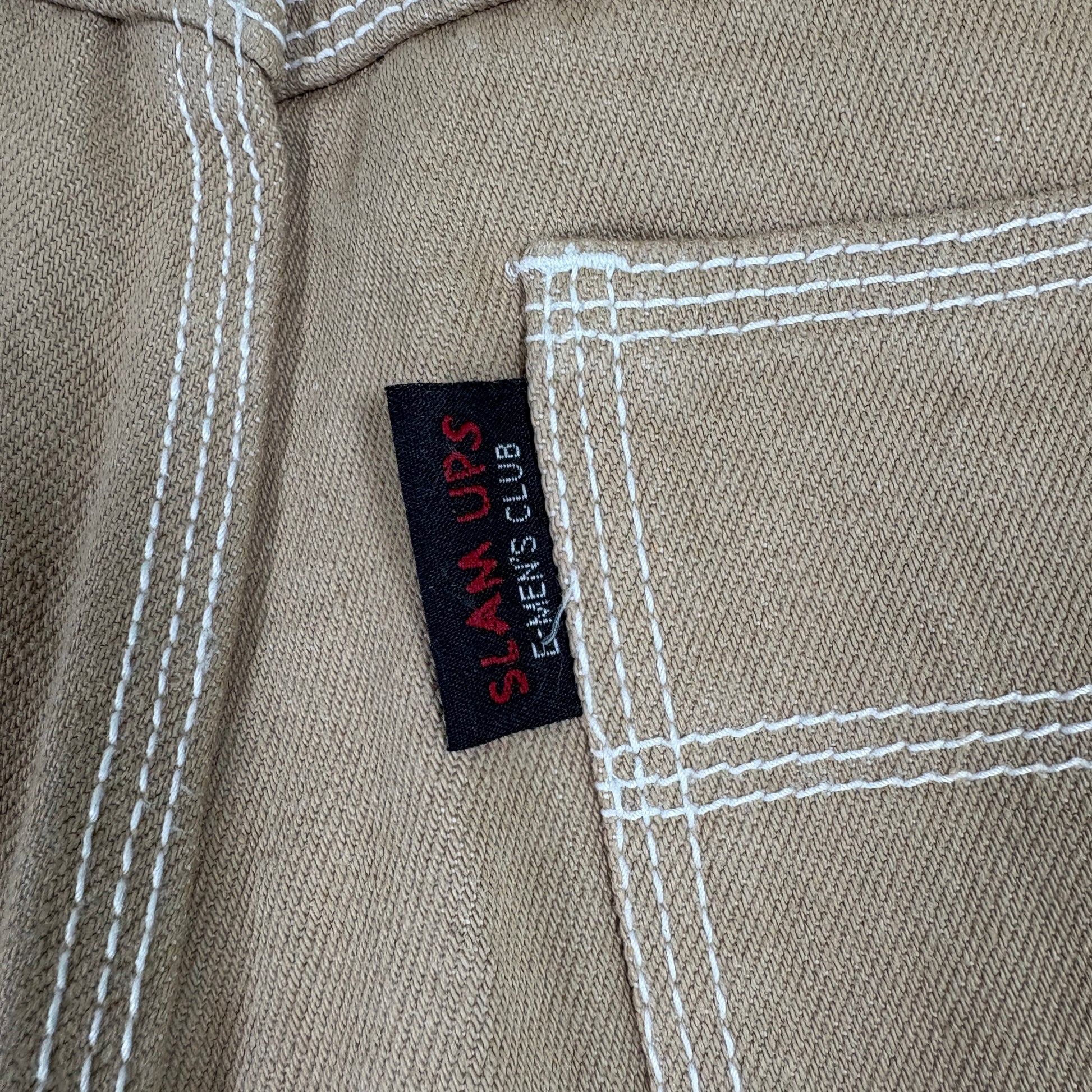 Slam Ups carpenter pants in tan khaki, built with durable cotton and utility pockets for classic workwear function. Features a relaxed straight leg fit with contrast stitching and side tool pockets for authentic Y2K skater/workwear appeal.