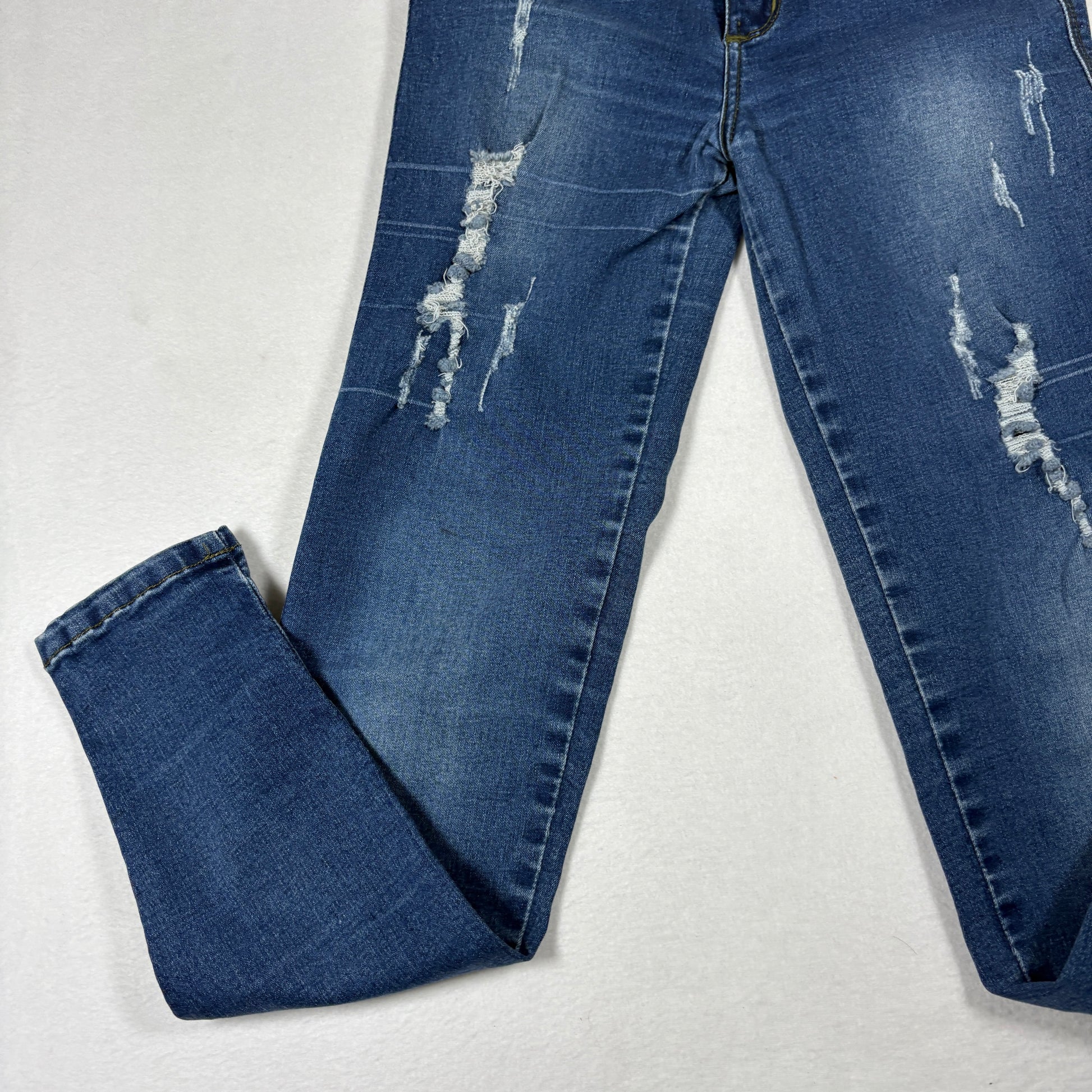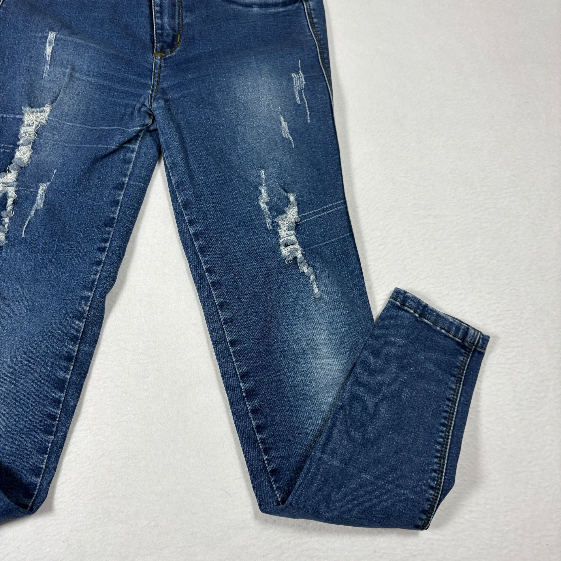 ✓ Dark Wash Denim with Heavy Distressing