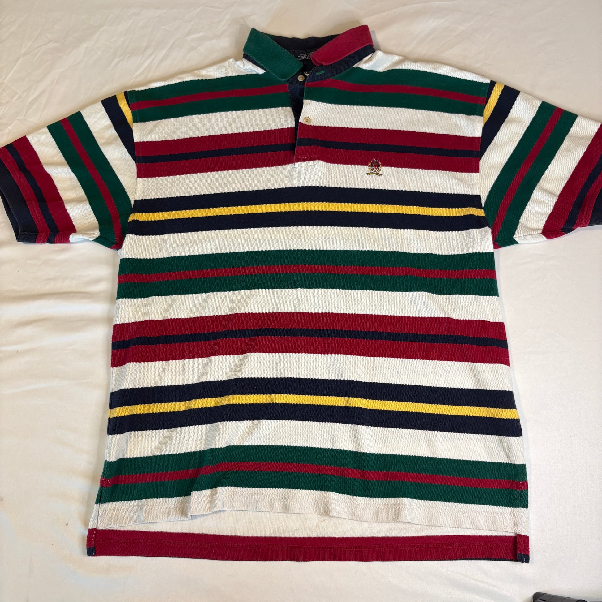 Tommy Hilfiger, polo shirt, men’s clothing, size large, L, striped polo, short sleeve shirt, casual wear, multicolor stripes, cotton shirt, preppy style, classic polo, men’s fashion, embroidered logo, collared shirt, summer shirt, casual polo.