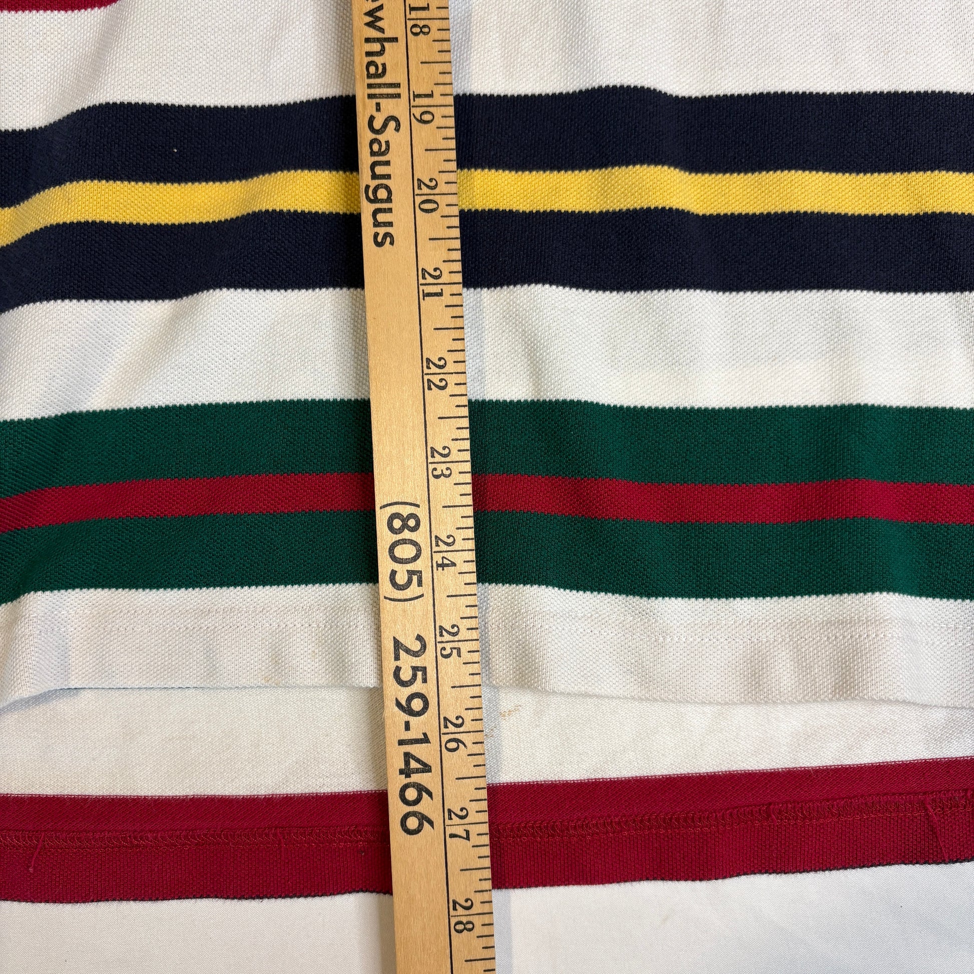Up for sale is a Tommy Hilfiger Men’s Polo Shirt in size Large, featuring a bold multicolor stripe pattern with green, red, navy, yellow, and white. This shirt is made from 100% cotton, offering breathable comfort and classic style. It has short sleeves, a collared neckline, and an embroidered Tommy Hilfiger crest on the chest for an added touch of signature style.