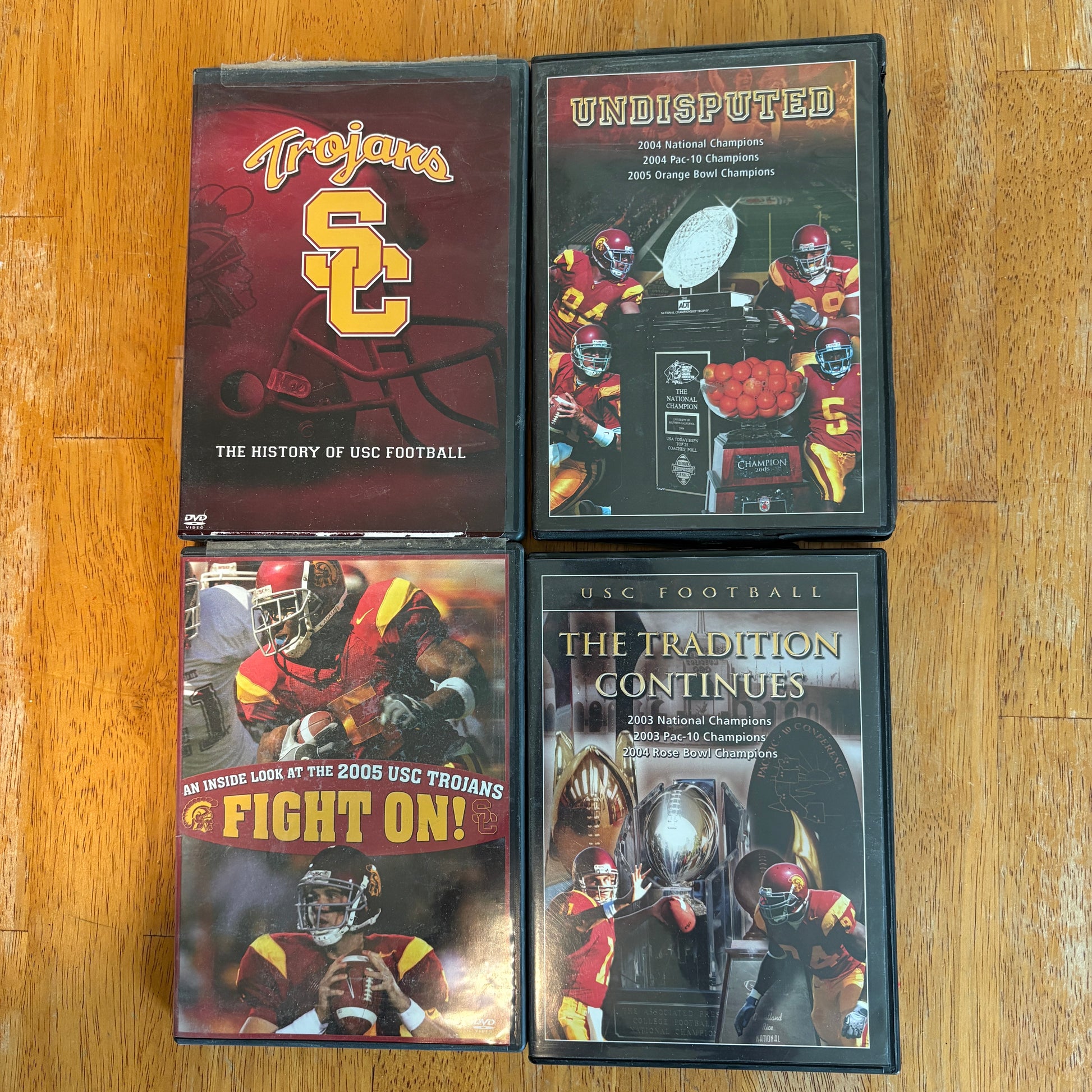 ✓ Lot of four USC Trojans football DVDs: History of USC Football, Undisputed, Fight On! 2005, and The Tradition Continues