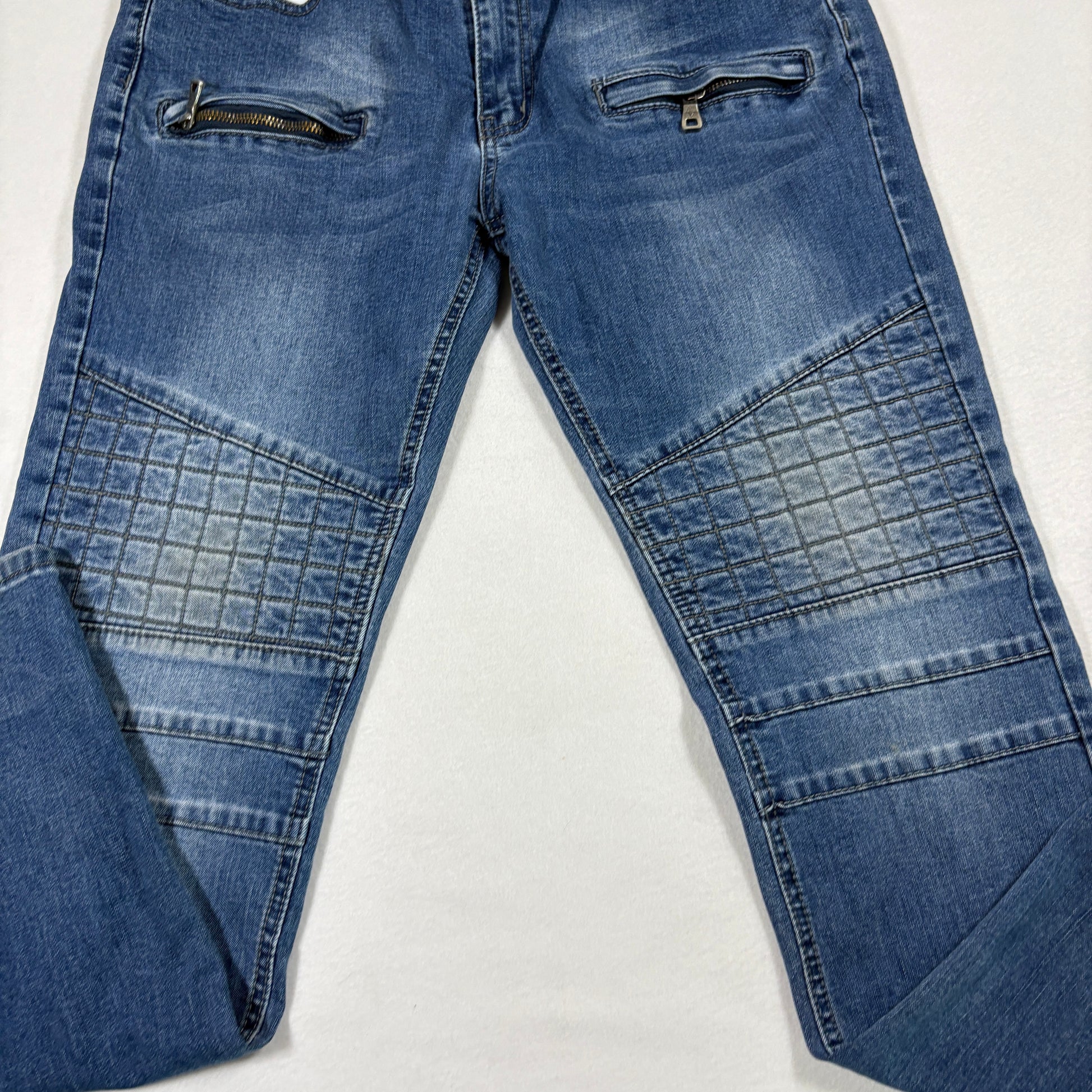 ✓ Details: Quilted moto knees, zipper pocket accents, distressed wash