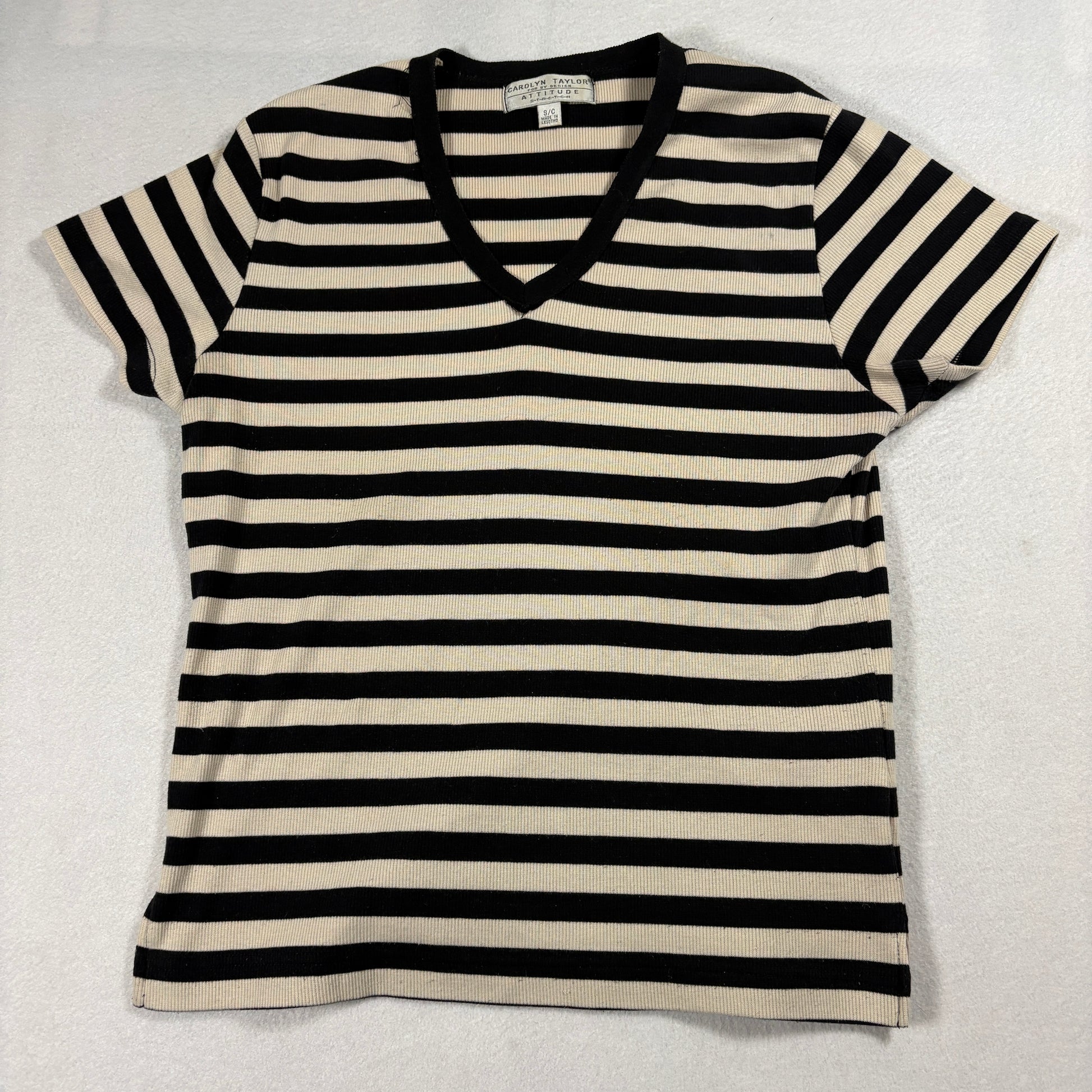 Vintage Carolyn Taylor Striped V Neck T Shirt Womens Small Black Beige Ribbed