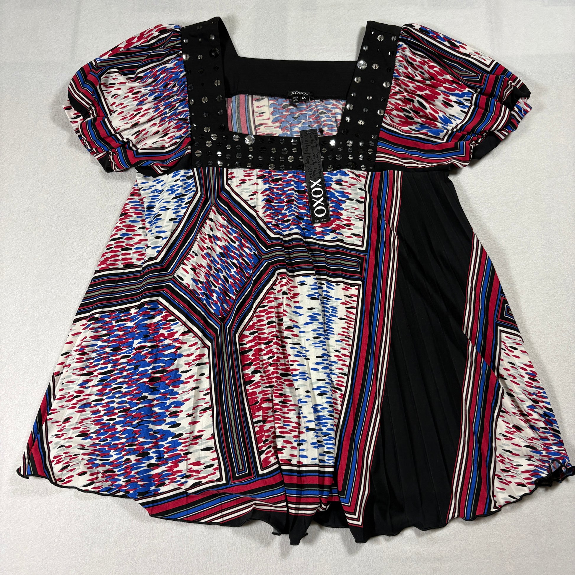 XOXO Womens Top Medium NWT Studded Boho Abstract Print Puff Sleeve Tunic