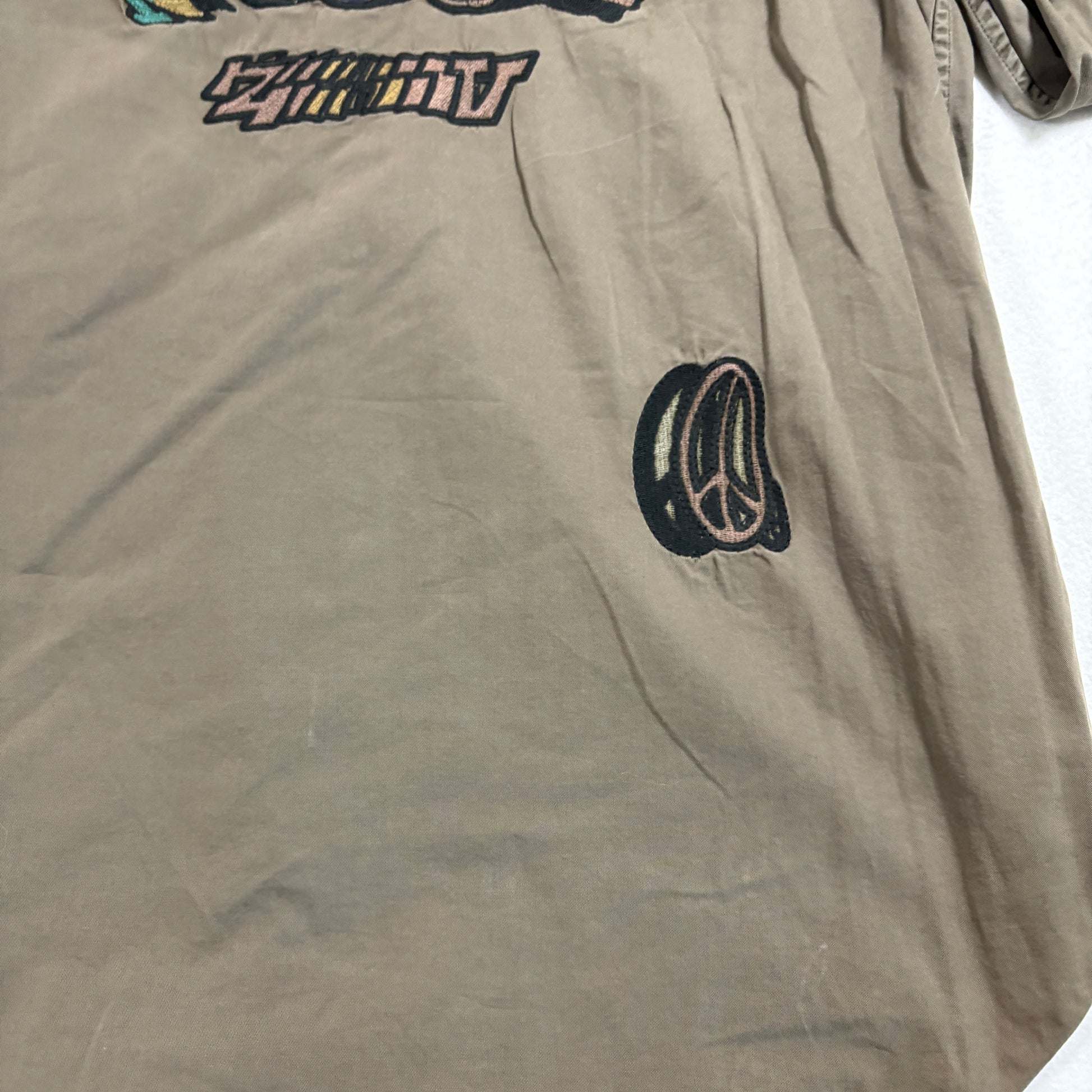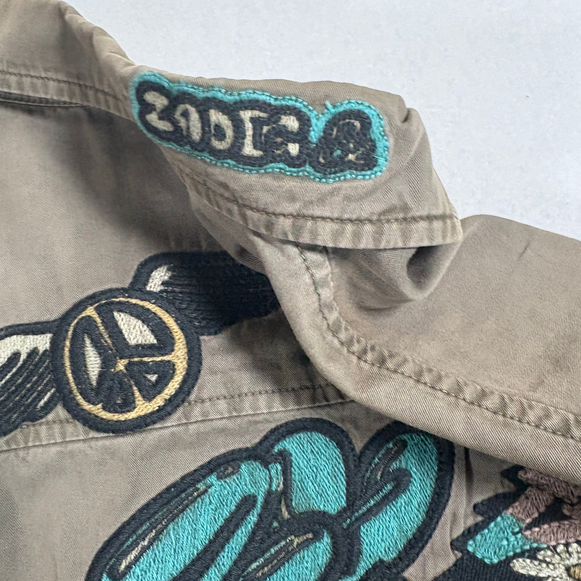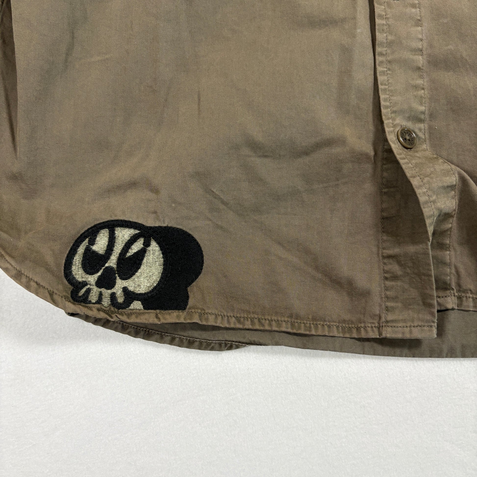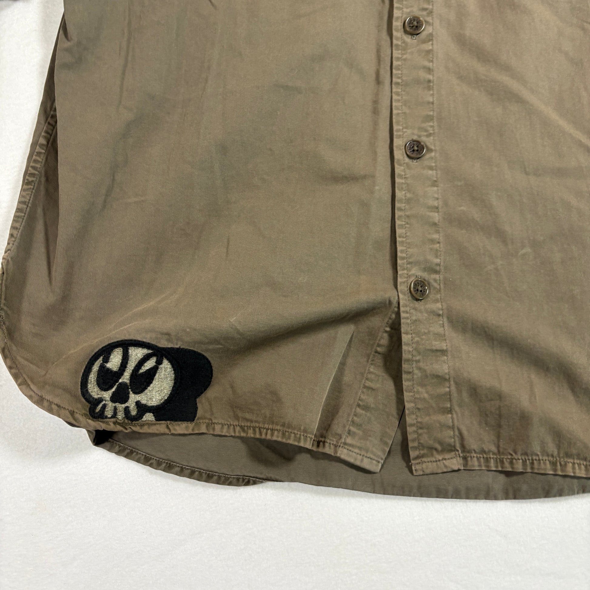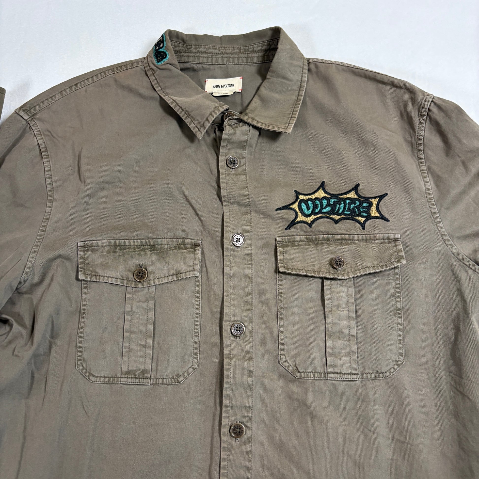 zadig voltaire, mens vintage shirt, khaki button up, embroidered military grunge, skull patch, y2k streetwear, surf graphic, peace sign