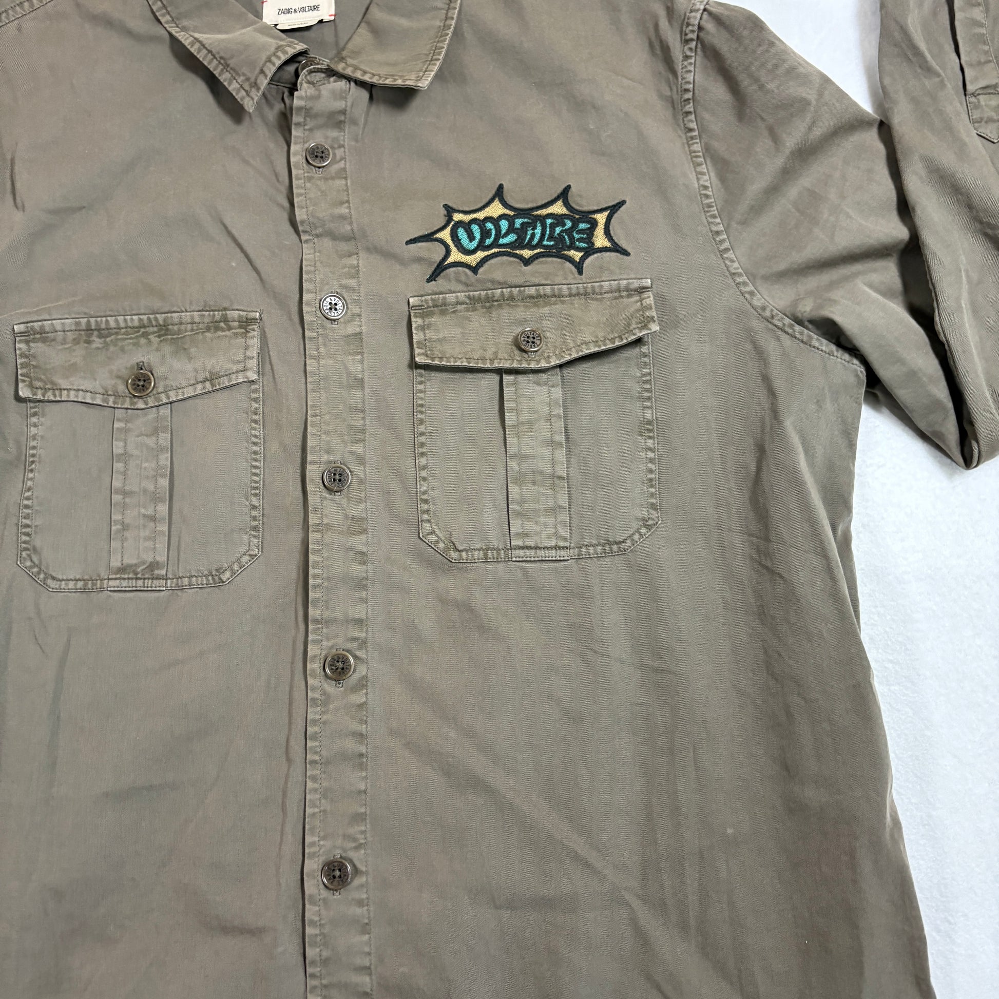 Zadig Voltaire Mens Button Up Shirt Large Khaki Military Embroidered Skull Vintage