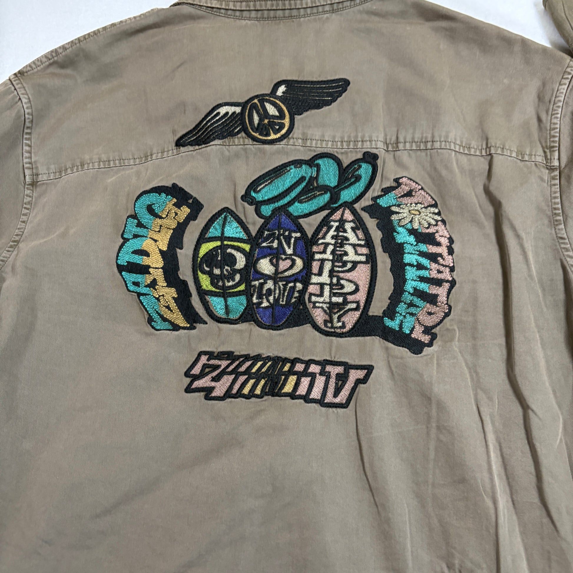 Rare Zadig & Voltaire mens shirt with heavy embroidery and military-inspired khaki base. Unique graphic back hit with surfboard-style designs, skull details, and Y2K grunge vibes make this a standout piece for collectors and streetwear fans.