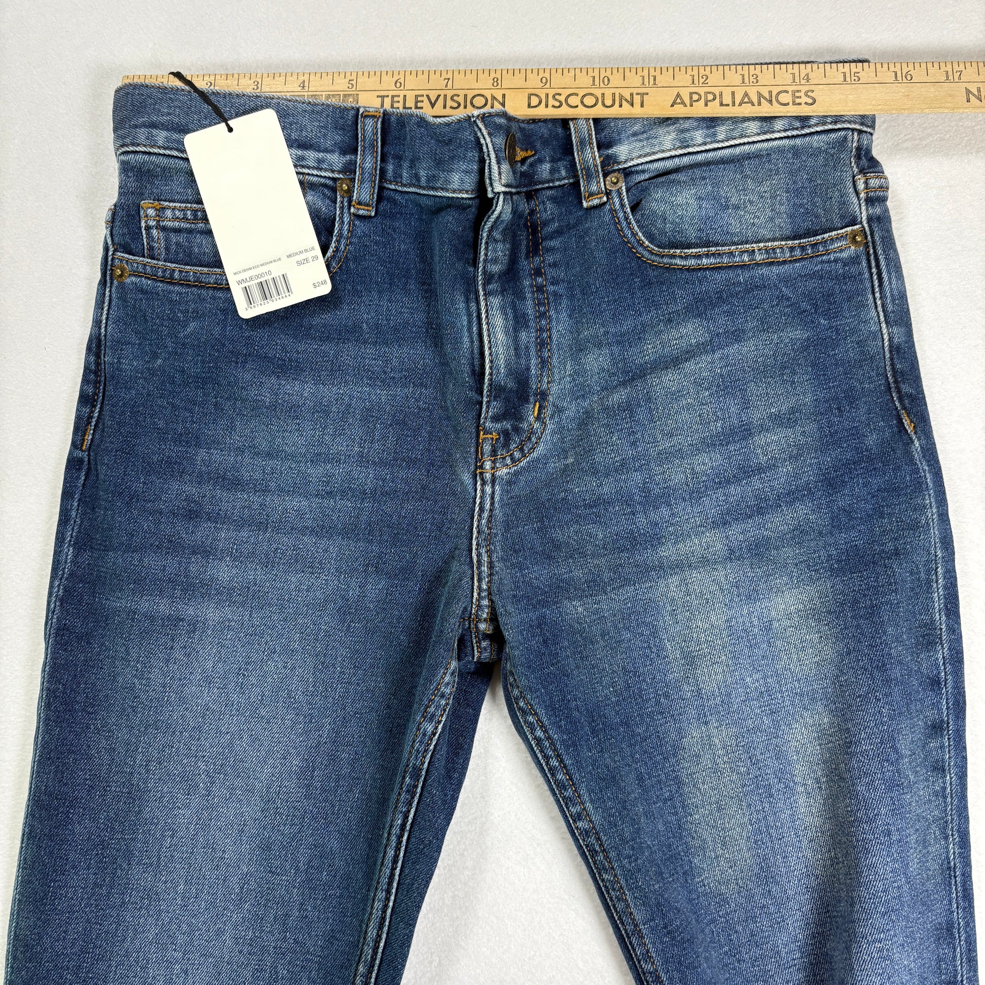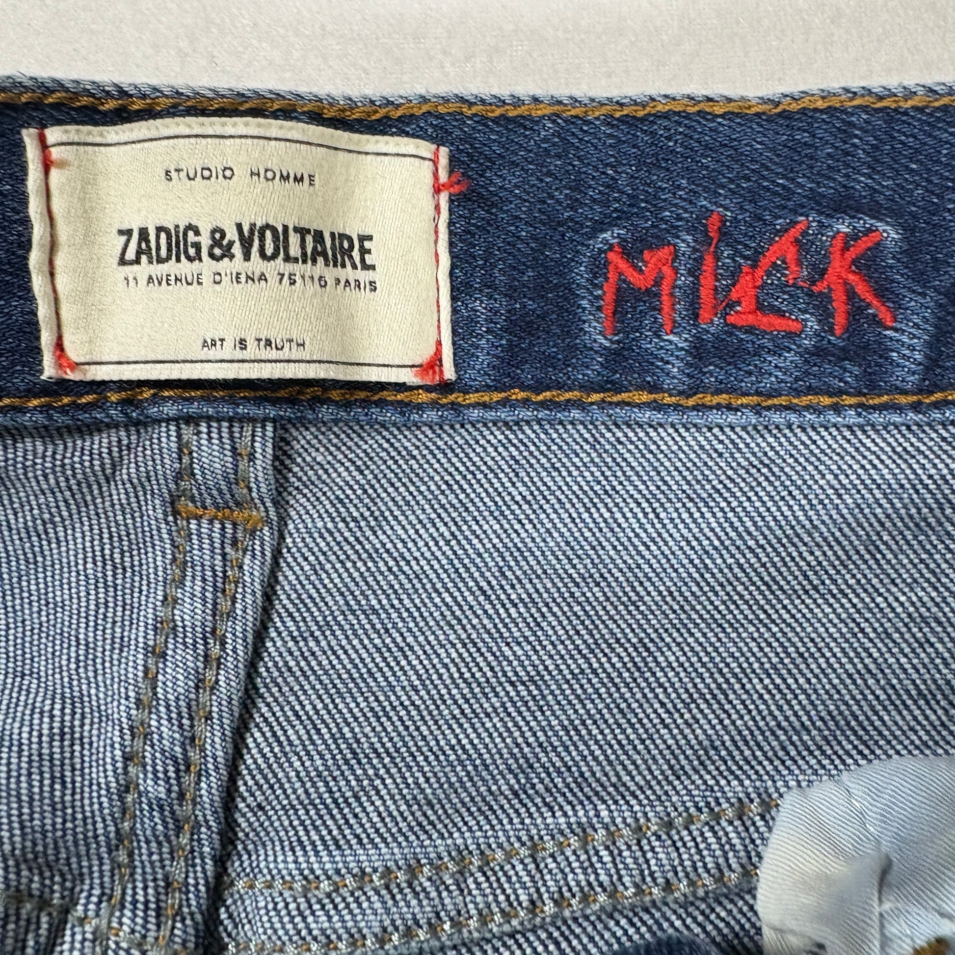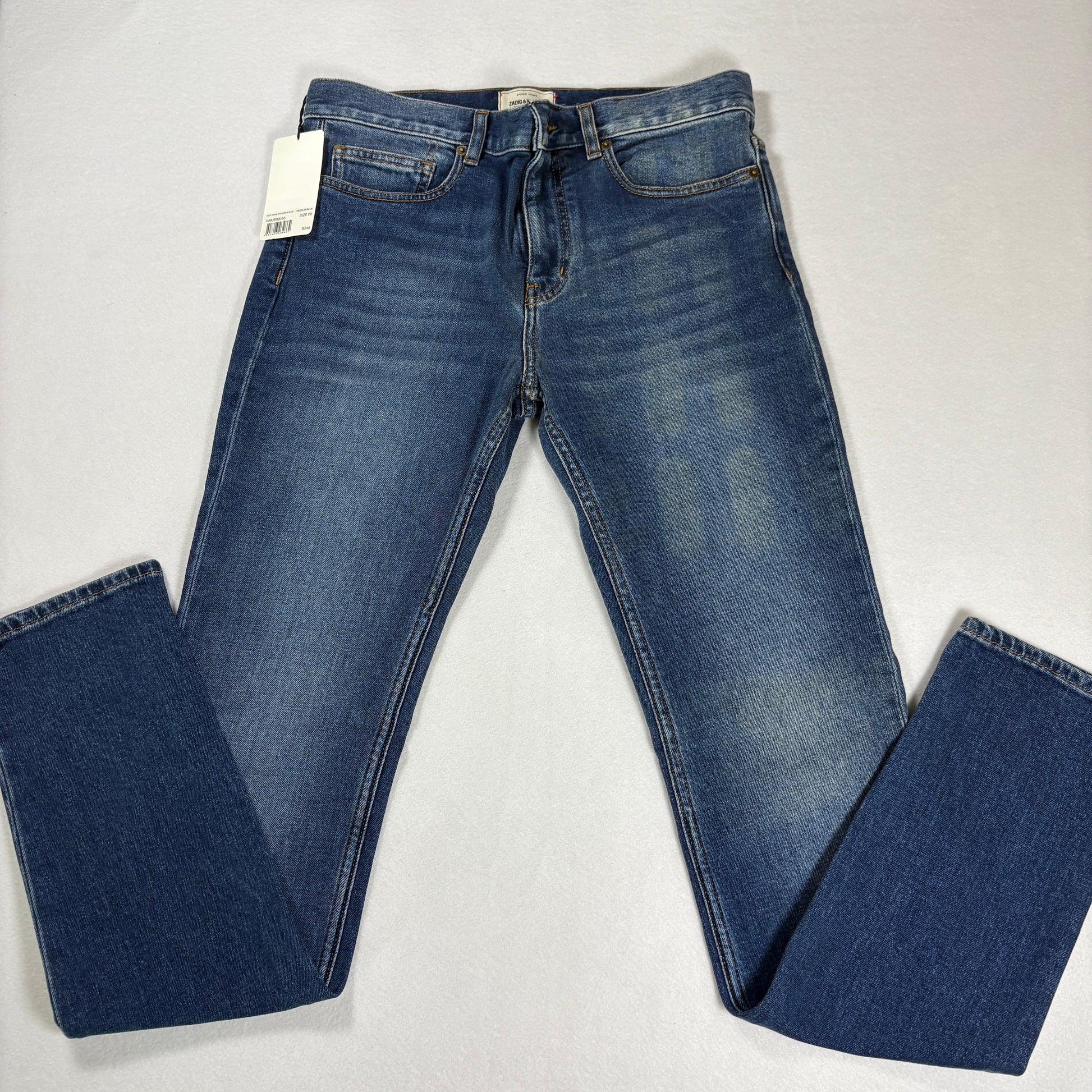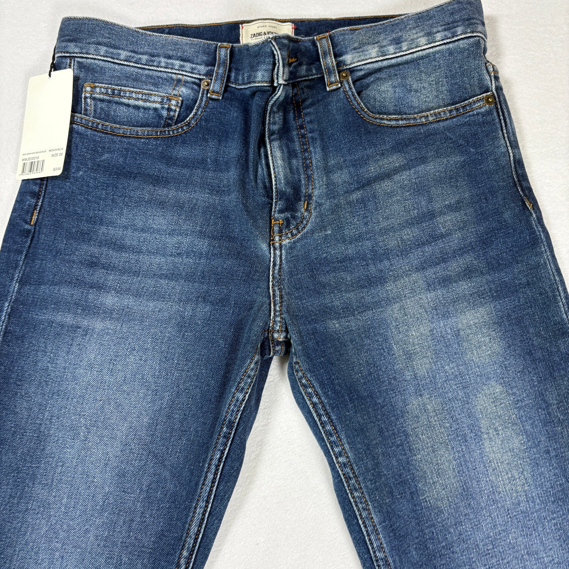 ✓ Zadig & Voltaire brand, ✓ Womens size 29, ✓ Mick Denim Eco model, ✓ Medium blue wash, ✓ Skinny fit, ✓ Premium stretch, ✓ NWT retail $248, ✓ Sustainable eco denim.